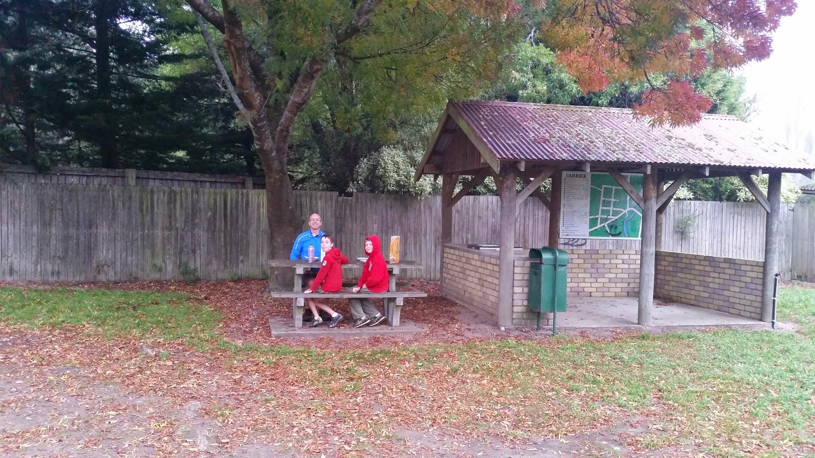 Keeping in mind that it was time change and that no one had informed our bellies, we stopped at a cute little town called Carrick for "first breakfast". Towns around here have public toilets and a spot to eat and we took full advantage. Here we are eating Just Right while the town slept.